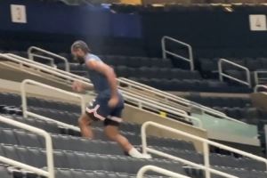 记者Noa Dalzell在赛前两个多小时拍到了在球馆内跑台阶训练热身的莱昂纳德。